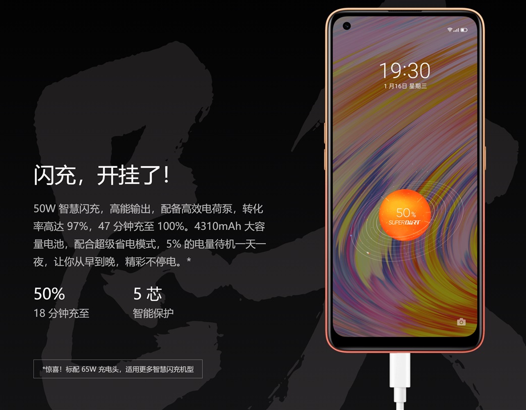 Realme V15 5Gは50Wの超急速充電に対応!通常の急速充電が10W~18Wほどなので、単純に考えて2倍以上もの高出力の充電に対応できるハイスペックっぷりです。安価なスマホながらもここまでの出力に対応しているのは驚きですね。