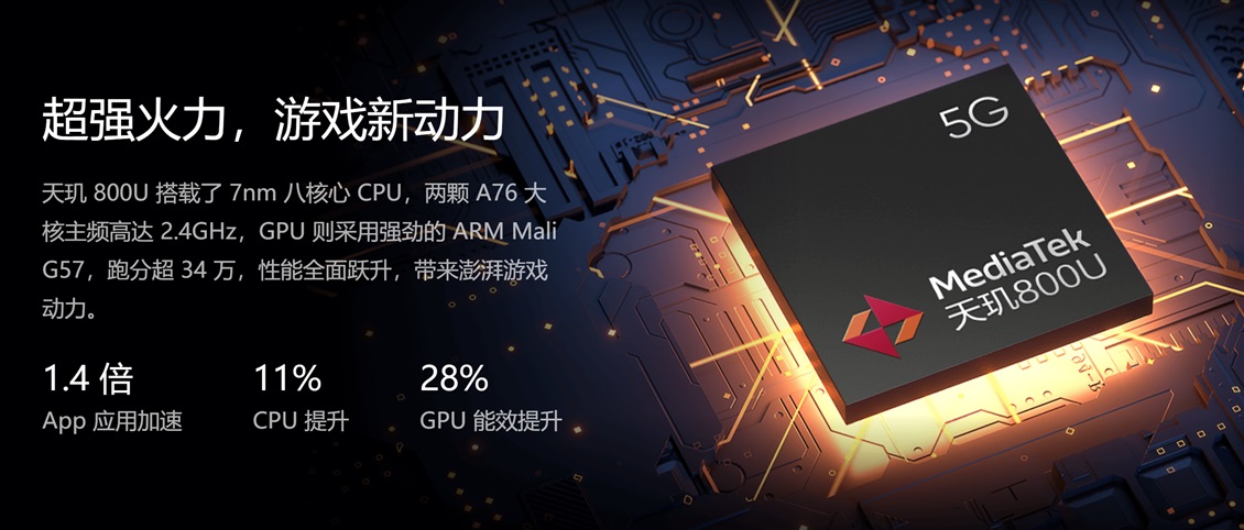 Realme V15 5Gはハイエンドに次ぐ高い性能を持つミドルハイの「Dimensity 800U」を搭載。