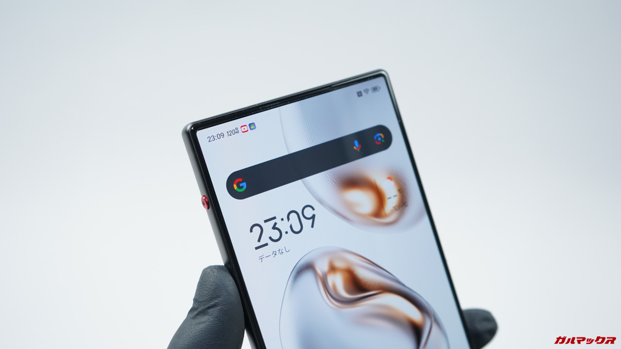 ▼ディスプレイはREDMAGIC伝統の欠けのないタイプ!インカメラは謎の技術で画面の下に埋め込まれてます。↓