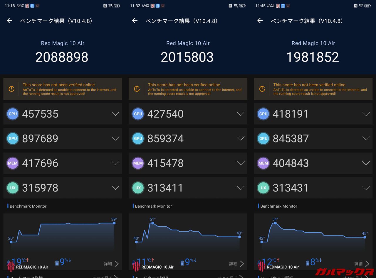 高負荷なゲームをプレイするときに気になるのが発熱。上述した通り、薄型化に伴いREDMAGIC伝統の内蔵ファンが無くなってます。