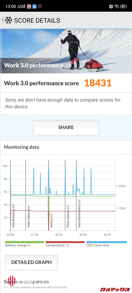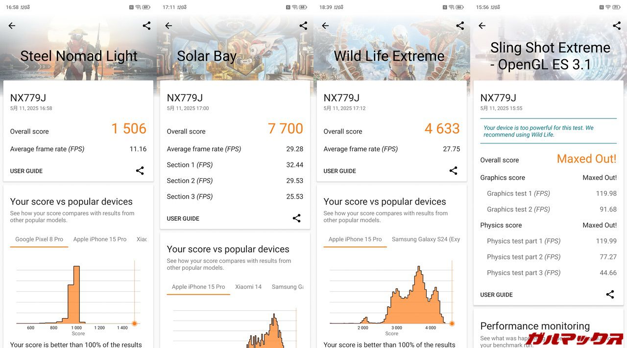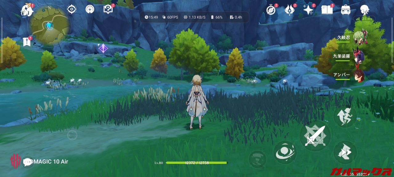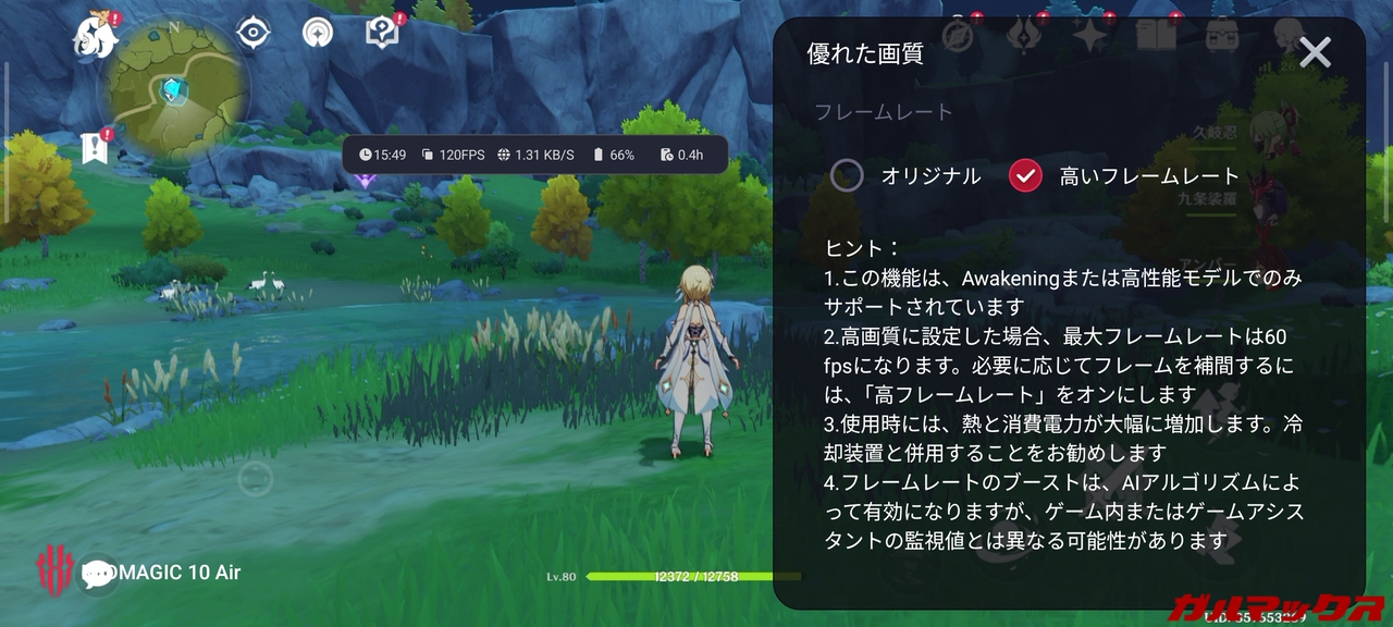 ゲーム性能の検証でよく見かける原神での画質最高+60FPS設定はSoCの底力を見るためのベンチ的な設定です。このような設定は発熱も高くなり電池持ちも悪くなります。「ゲームを快適に遊びたい」という本来の目的であれば、ゲームのグラフィック設定は妥協できるまで下げて負荷を軽くする方向性の煮詰め方をガルマックスはオススメしています。