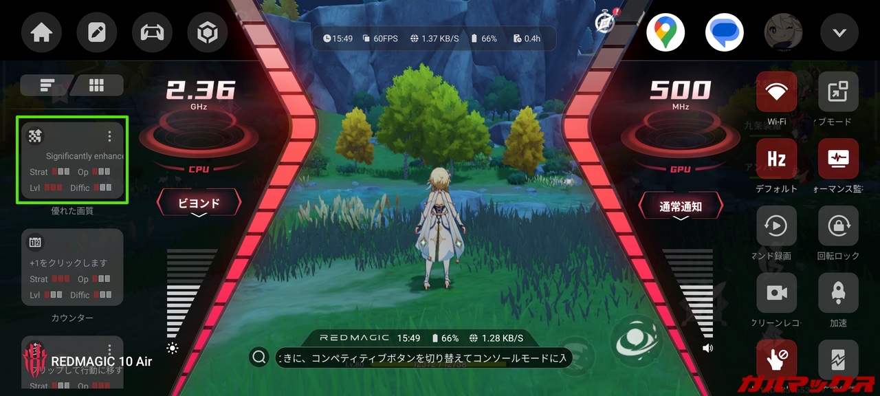 ▼またゲーム中は画面の端からスワイプすることでゲームコンソールを開くことができ、ゲーミング機能のオン・オフなどが行えます。もちろんここでの設定もゲーム毎に保存されます。↓