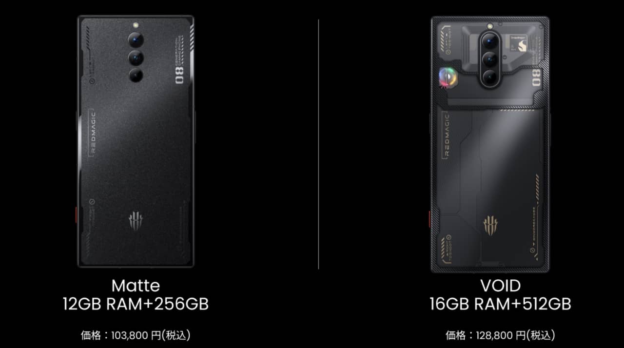 RedMagic 8 Proはあまり派手ではない「Matte」とゲーミングモデルらしいインパクトある透明背面パネルを採用した「Void」から選べます。透明はちょっとお値段高くなります。
