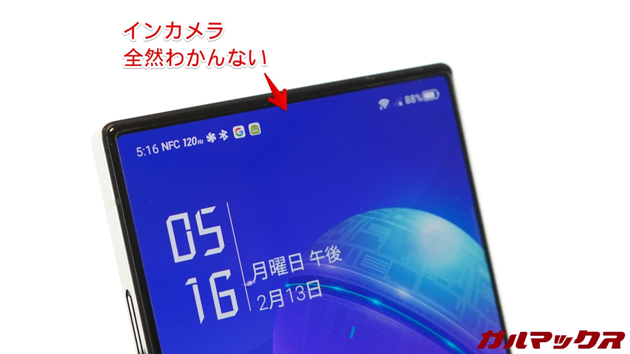 ▼インカメラどこいったんだー!って感じなんですが、なんとディスプレイの下に埋め込まれてます。もうパッと見ではカメラの位置が分かりません。↓