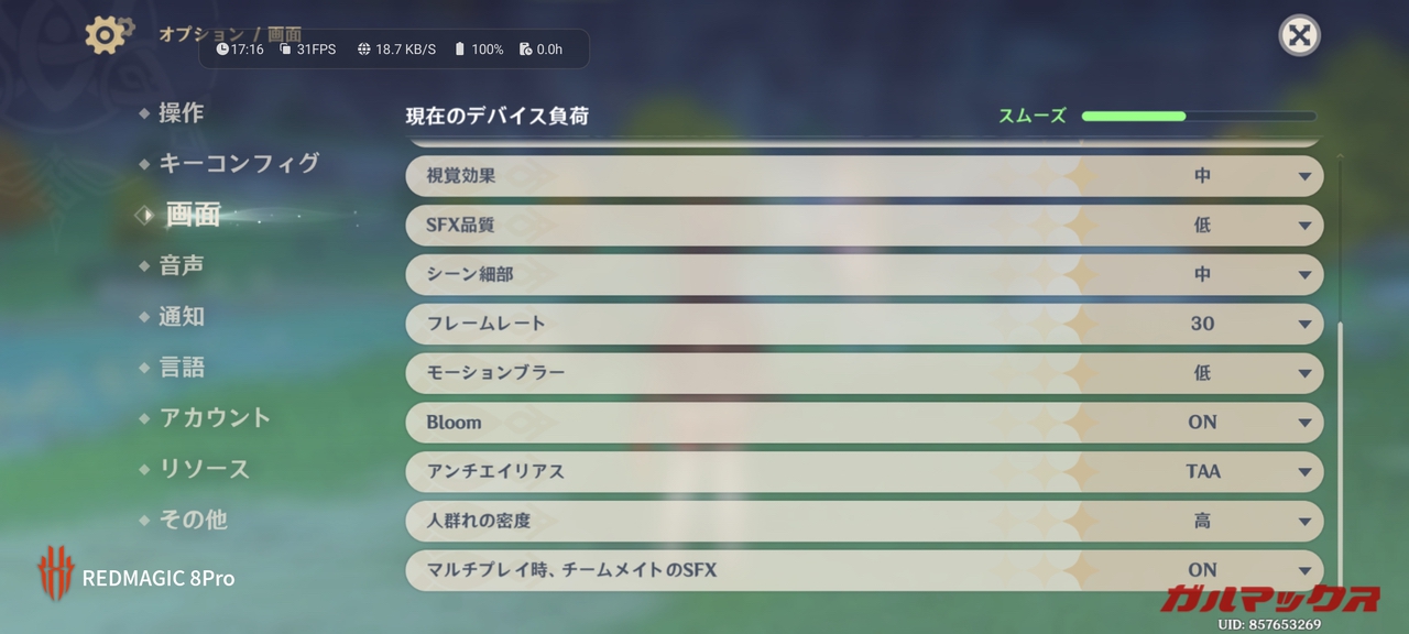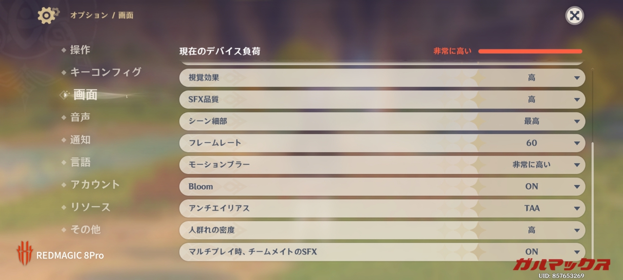 ▼いつもの検証はデフォルト設定で行うんですが、RedMagic 8 Proは「中」となっていました。この状態でフレームレートを60に設定してフレームレート計測しています。↓