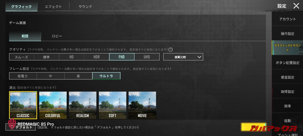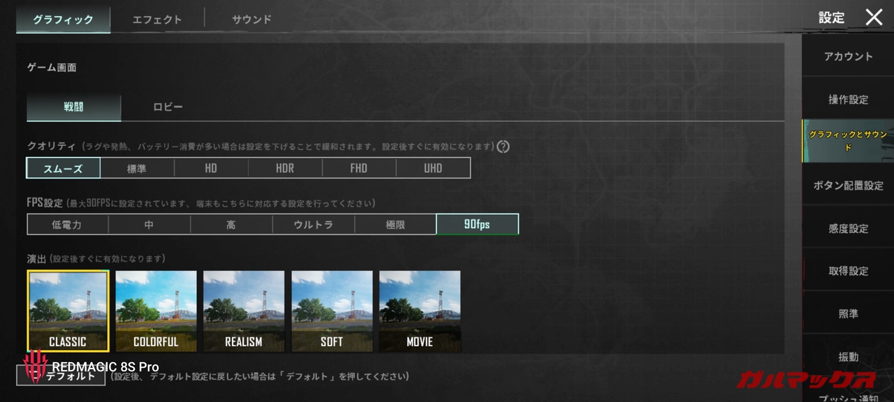 画質をスムーズから標準へ上げるとフレーム設定は「極限(60FPS)に制限されます。画質を更に上げて極限設定を維持できる範囲を調べてみると、最大で画質「FHD」まで「極限」でプレイ可能でした。が、恐らくPUBGモバイルを本格的に遊んでいるユーザーさんはスムーズ+90fps一択でしょう。90fps設定が出来る点が大きな魅力かと思います。