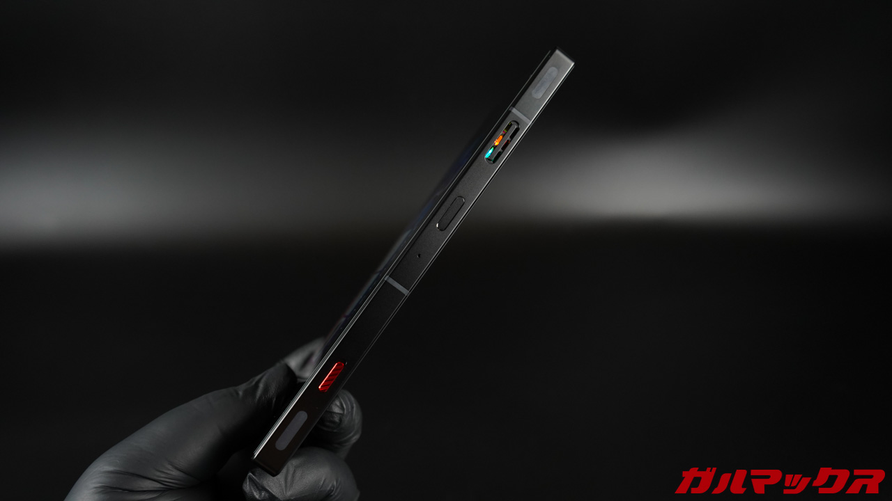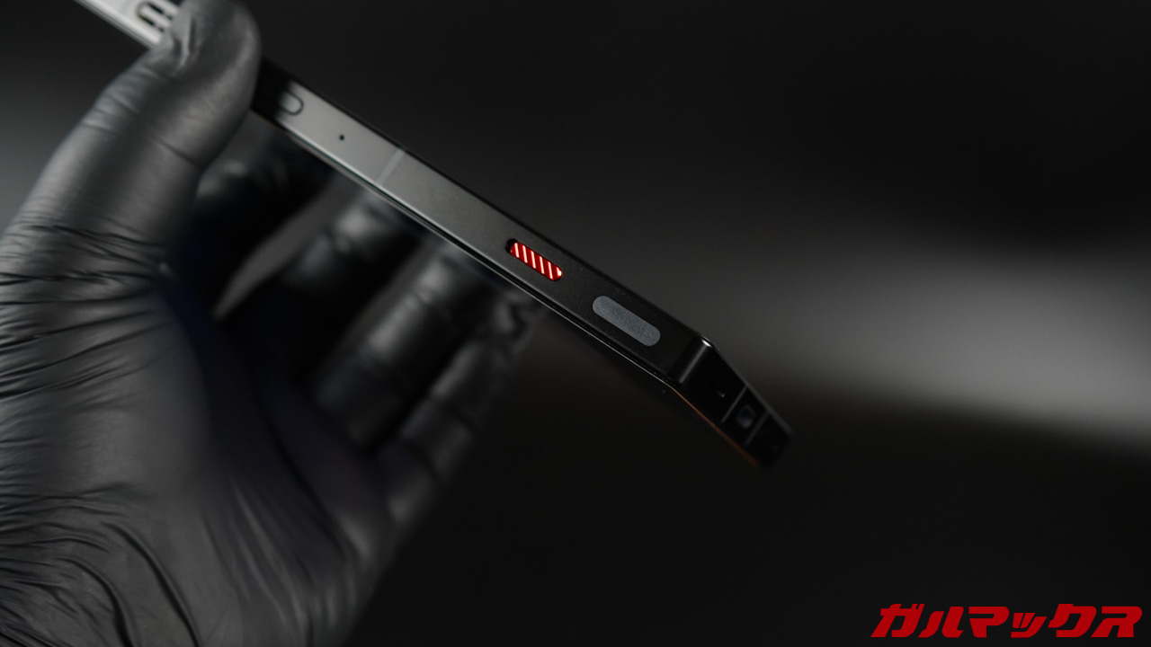 ▼右の側面にはゲーミングスマホ特有のギミックであるLRのタッチボタンが備わってます。また、RedMagic 8S Proは簡単にゲームモードへ切り替えられるスイッチも搭載。↓