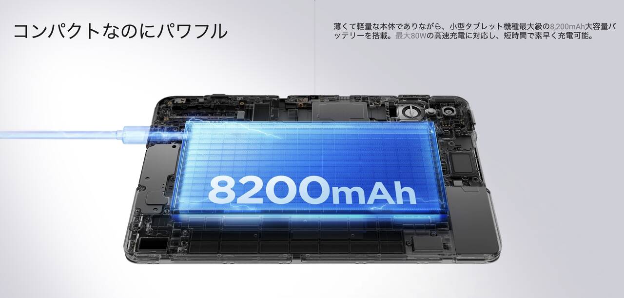 バッテリーはたっぷり8,200mAhを搭載。最大80W充電に対応していて充電速度が速いのでゲームの休憩中に一気に充電できそう。