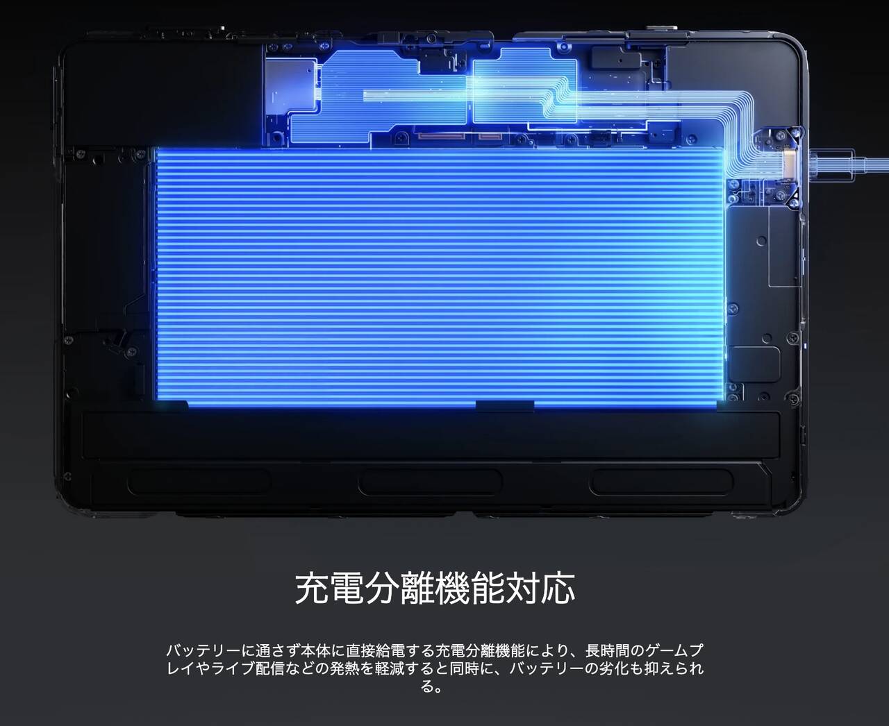 普通のスマホやタブレットだと充電しながらプレイした場合にバッテリーの劣化を速めてしまいますが、バイパス充電はバッテリーを通さずに直接本体に給電することが出来るんです。