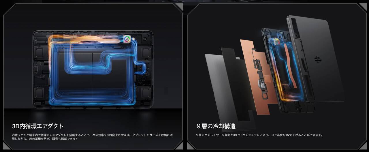 ▼冷却ファン部分はゲーミングモデルらしいRGBライトも搭載!シースルーっぽいデザインが施されていたり普通のタブレットとはまた違った雰囲気で良い感じ。↓