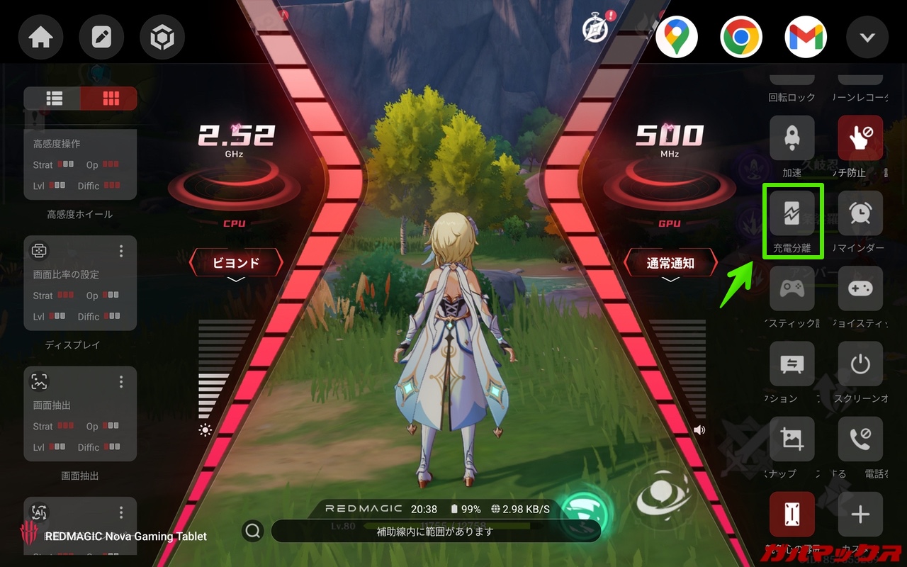 ▼そのあたりもREDMAGICは十分わかっているのでシステム直給電のバイパス充電機能(REDMAGIC Novaでは分離充電という機能名)を搭載してます!使うにはゲームパネルから「分離充電」をオンにする必要あり。↓