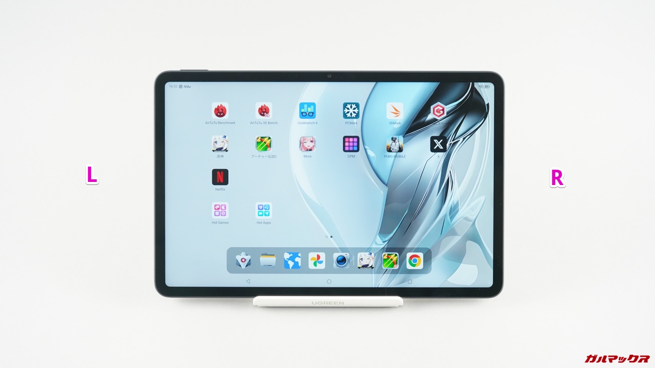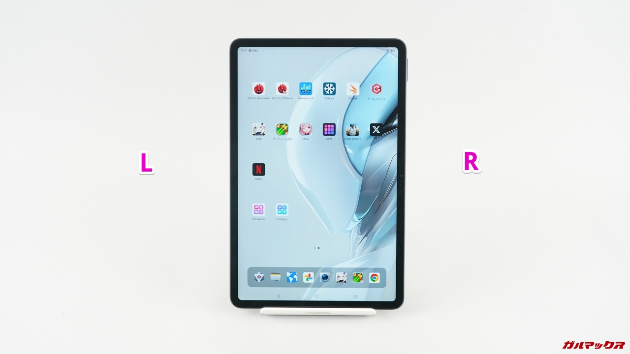 スピーカーは4つ備わっているクアッドタイプ。安もんと違って縦でも横でもちゃんとステレオになるタイプ!