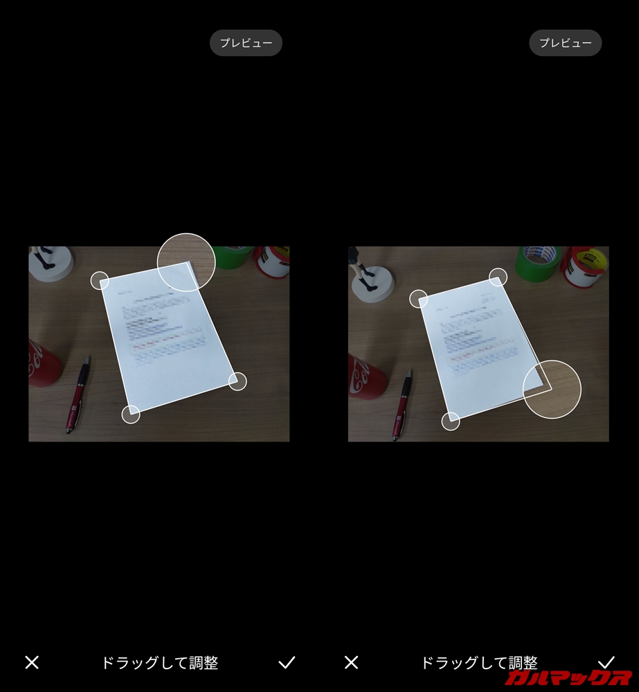 ▼撮影後はトリミング画面が出てくるんですが、書類が認識できれば最初から合わせられているので便利。もちろん任意のサイズにもできます。↓