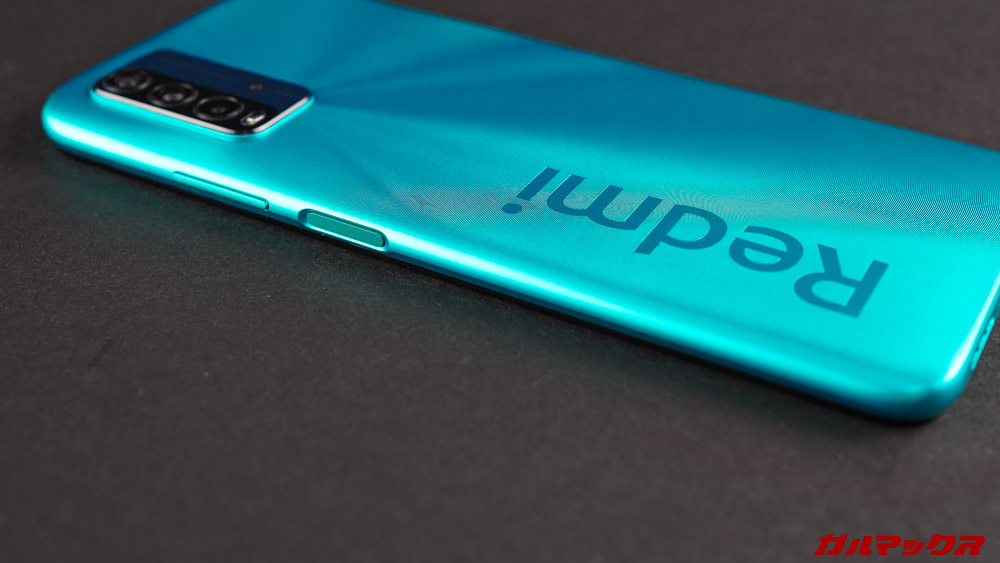 ▼Redmiのデカいロゴも入っていますが、あまり目立ちません。控えめな子です。筆者からすれば全然気にならん!デカいロゴがダサいって理由で敬遠する人にとっては、このRedmi 9Tは許容範囲かどうか個人的に気になりますがどうなんでしょう。↓