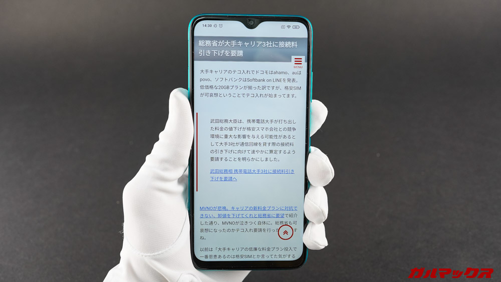 ディスプレイ形状はちょっと懐かしさを感じる水滴ノッチ形状で、2年ほど前までスマホの主流だったタイプ。トレンドとか古臭さとかはさておき、上下のベゼルがないだけ縦に長くなったので、ニュース、SNSでは一度に増える情報量が多く見やすいのがイイトコロ。