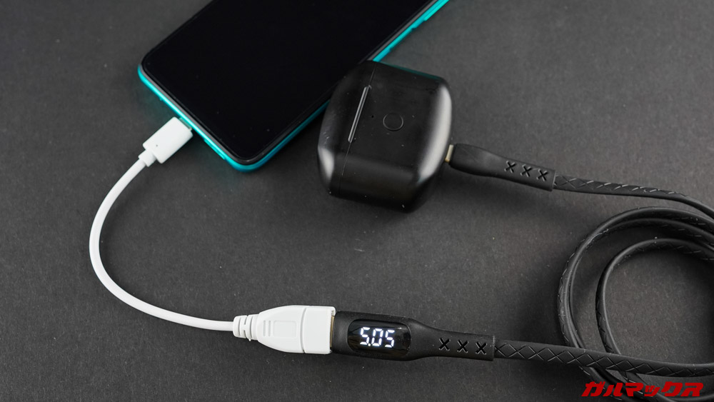 ▼これだけのバッテリーのデカさなので、逆充電ケーブルを使って周辺機器(ワイヤレスイヤホンなど)へ充電するにもピッタリです。なお電圧を計測したところ2.5W(5V/0.5A)だったので、スマホへの逆充電は遅すぎる意味で不向き。アクセサリー充電向けです。↓