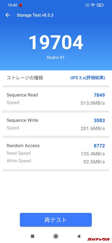 ▼ストレージ速度は読み込みが513MB/s、書き込みが201MB/s。遅さに困ることはないレベル。つまり標準的です!このクラスなら十分!↓