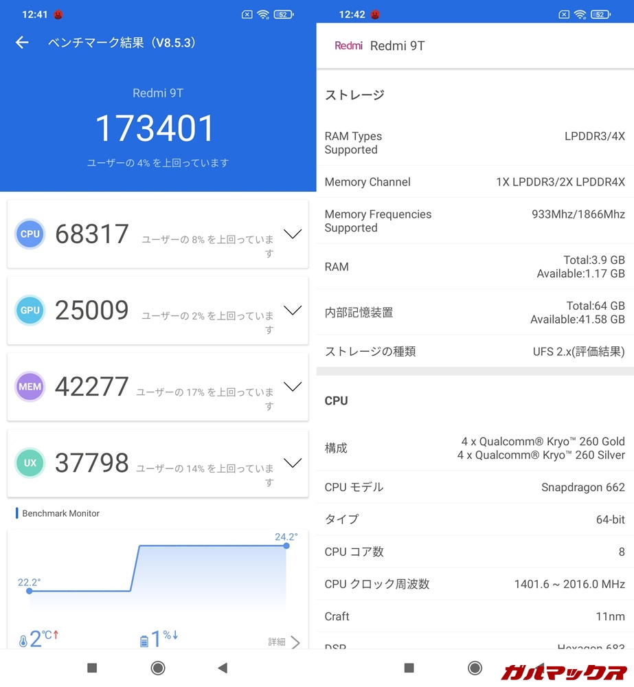 ▼Redmi 9Tの実機でAnTuTu(Ver8)を測定しました!総合スコアは173,401点、GPUスコアは25,009点です!↓