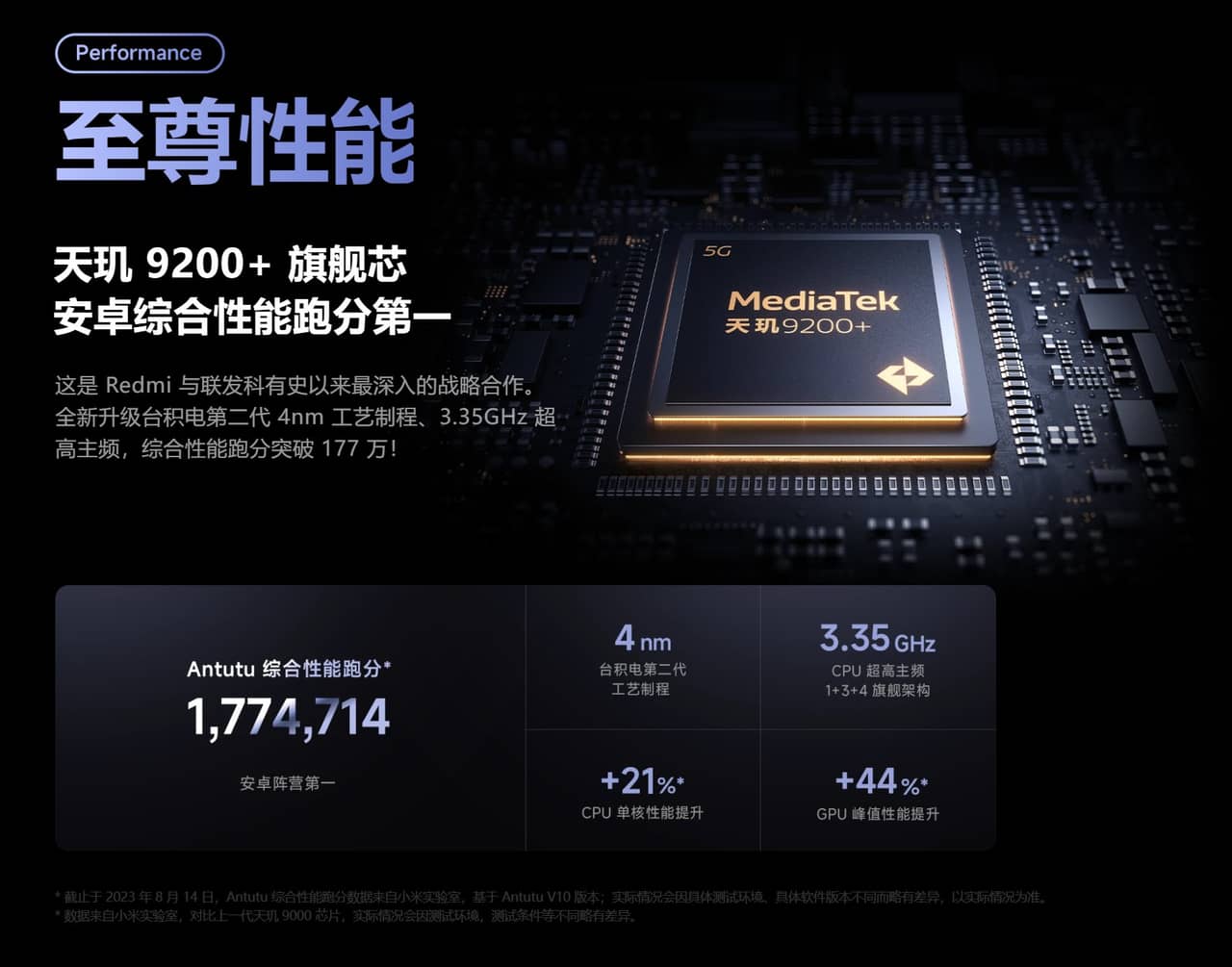 ▼個人的にやはり注目点はSoC!MediaTek Dimensity 9200+を搭載しておりAnTuTu公称値は177万点というアホみたいな高さを叩き出しとります。Snapdragon 8 Gen 2超えじゃねこれ?↓
