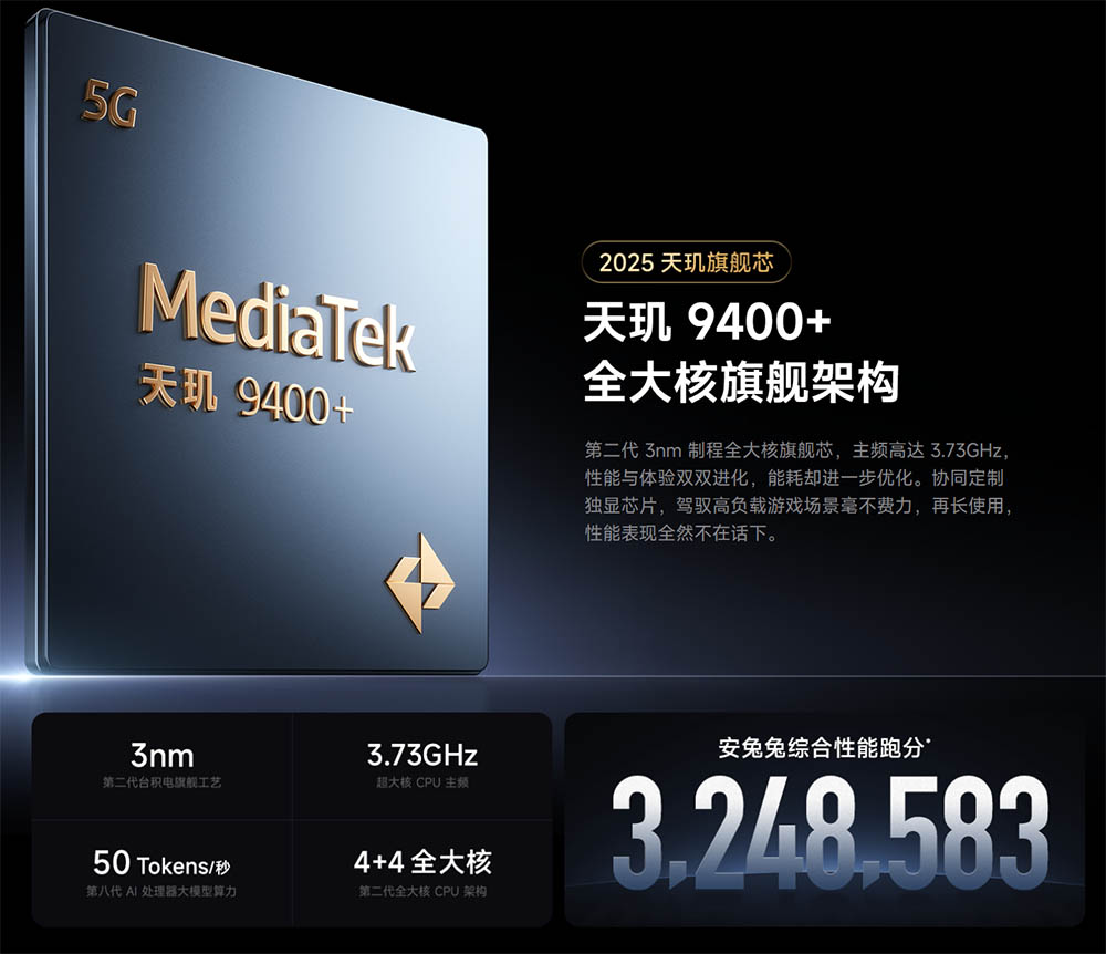 ▼SoCにはDimensity 9400+を搭載。Dimensity 9400+はDimensity 9400の改良版で、AnTuTuスコアの公称値は320万点!普段遣いでストレスを感じることはまずないでしょうし、最重量級ゲームも高画質でガンガンプレイできる性能です。↓
