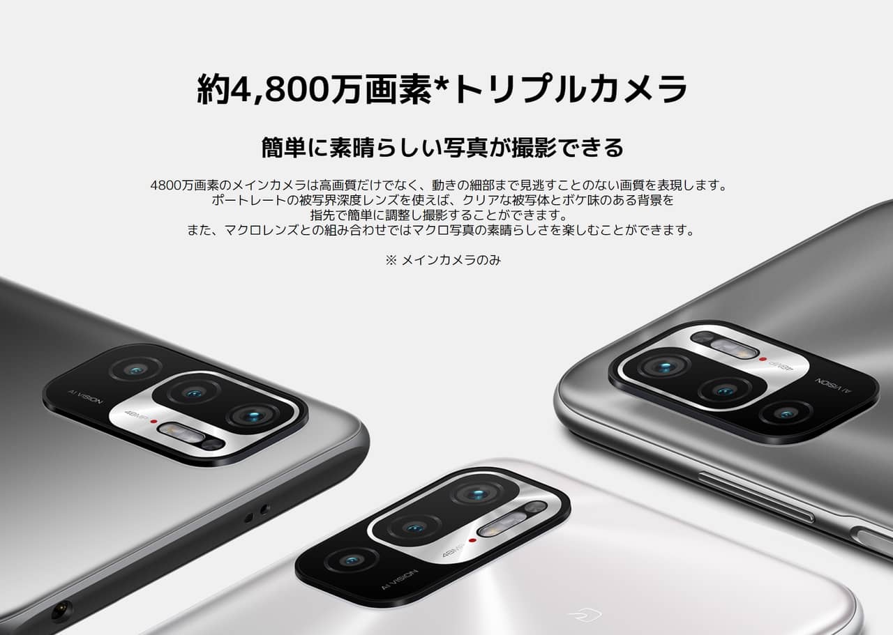 ▼Redmi Note 10 JEのカメラは「4,800万画素のメインカメラ」「200万画素のマクロカメラ」「200万画素の深度測定カメラ」のトリプルカメラ構成となっています!↓