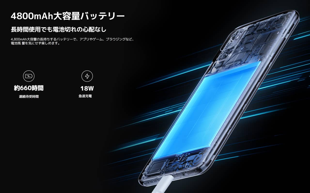 ▼バッテリー容量は4,800mAhと大型サイズ!長時間の使用にも耐えうるといわれており、長時間外出したり充電チャンスが限られる状況でも頼りになりそう!さらに18Wの急速充電にも対応しています!↓