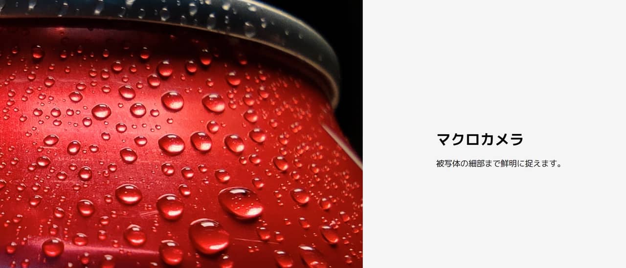 ▼サブカメラにはマクロカメラと深度測定カメラを備えています!マクロカメラは通常撮影よりもグッ!と被写体に寄れる特性があり、通常では撮影できない面白い写真を撮れるんです。また、深度測定カメラにより、一眼レフのように背景をぼかした写真も撮影が可能!↓