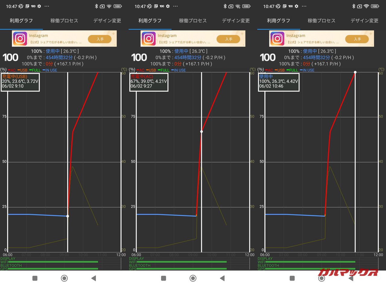 特に20%→67%なんてわずか17分。約50%近い電池を20分足らずで充電できちゃうって凄い。その後はバッテリーをいたわってるのかな?緩やかに充電が進んだみたいです。