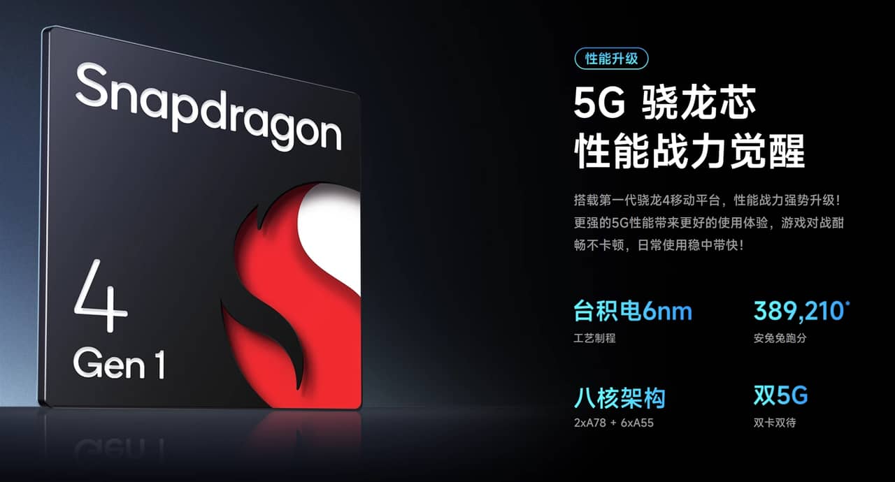 SoCはSnapdragon 4 Gen 1を採用していますよ!Snapdragon 4xxシリーズの最新チップで、立ち位置としてはエントリー…ではあるものの、公称AnTuTuスコアが389,210点とエントリーどころかミドルレンジでも上位レベルのスコアを叩き出しているようです。