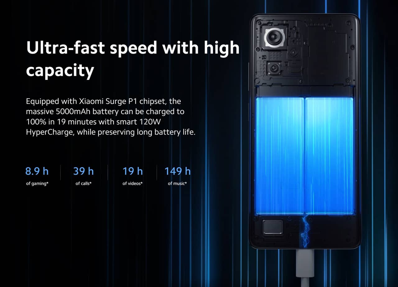 • 5,000mAhの大容量バッテリーで120Wの急速充電に対応