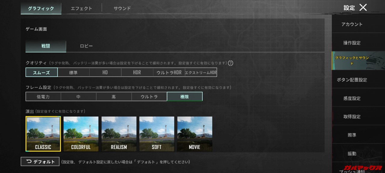 ▼一方PUBG:Mobileはスムーズ+極限(上限60FPS)の構成に対応していました!FPSゲームはなめらかさが重要故に玄人に好まれる構成。↓
