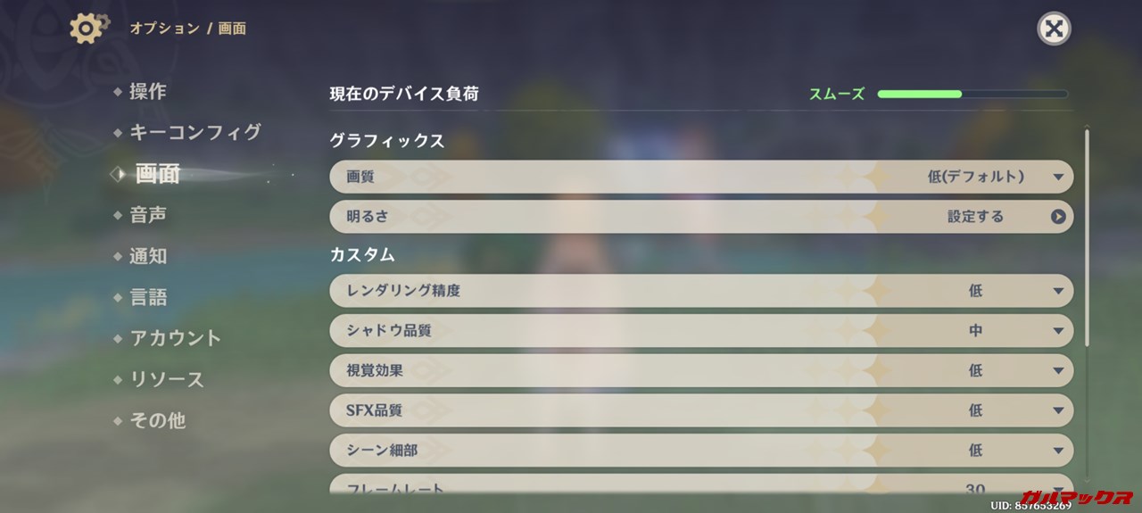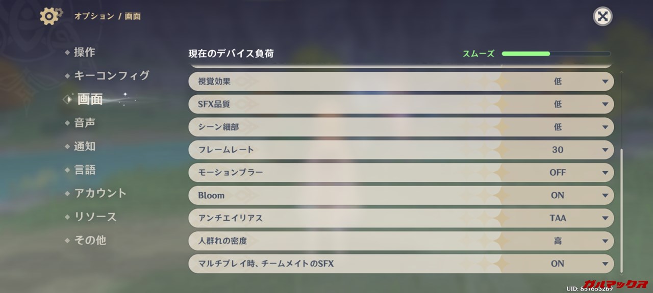 原神では下限30FPSを超えていますが、こののようなグラフィックをウリとするゲームでは「中」設定で遊びたいって方も多いハズ。