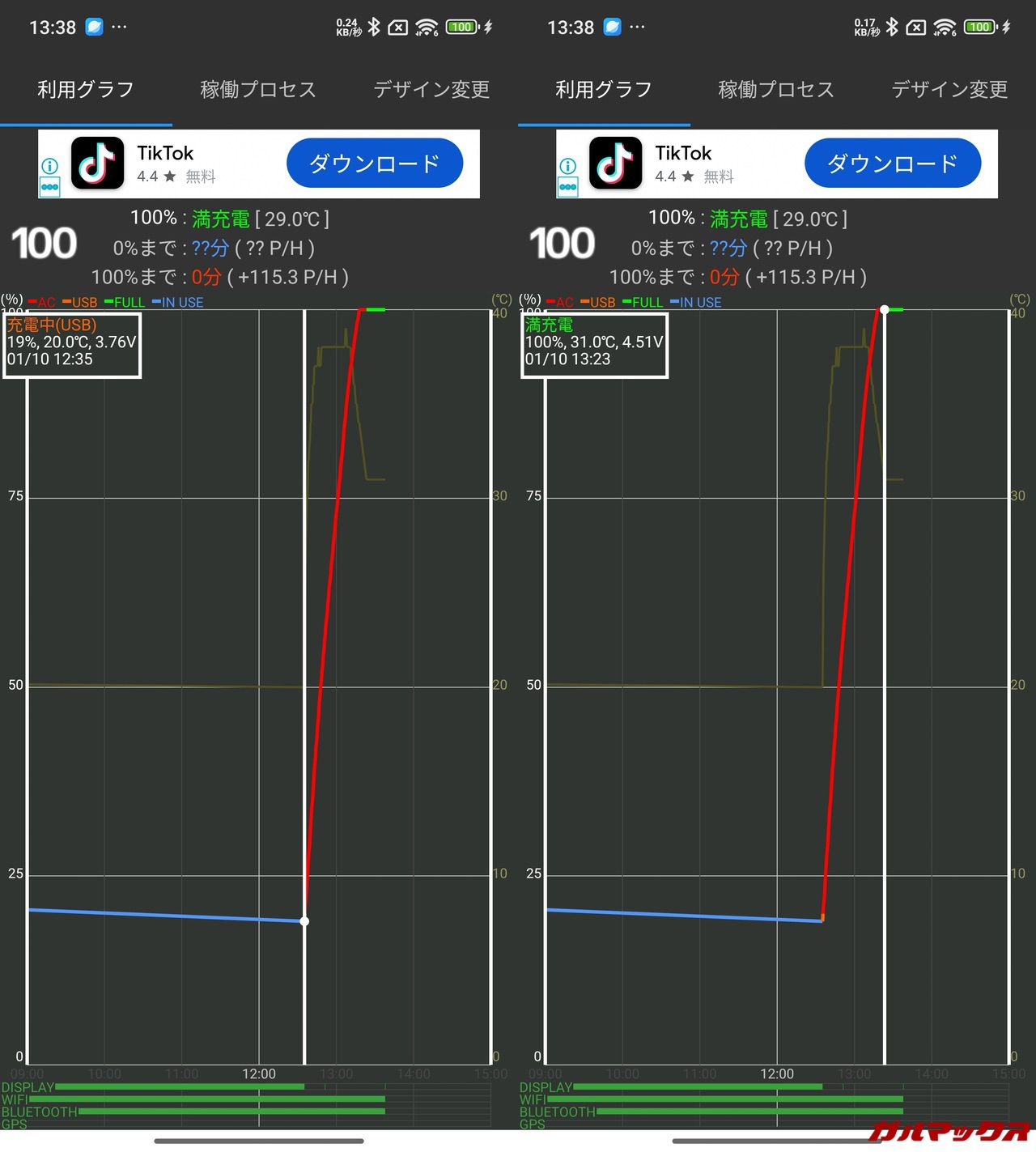 ▼45W充電だと充電速度は19%→100%まで48分。まあ、このくらいのスピードならまず困ることはないけれど。↓