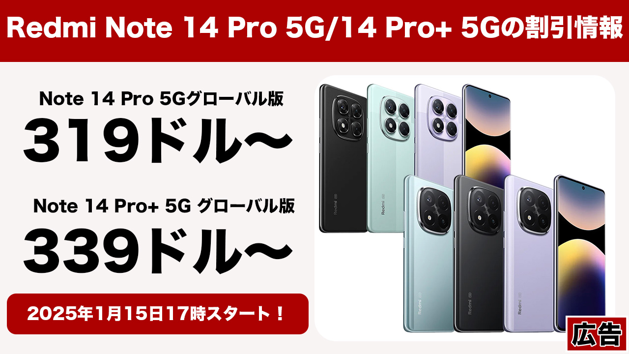 先日発表されたグローバル版の「Redmi Note 14 Pro 5G」と「Redmi Note 14 Pro+ 5G」が1月15日17時から初売り開始!かなり安くなるので検討されている方は絶対にお見逃し無く。