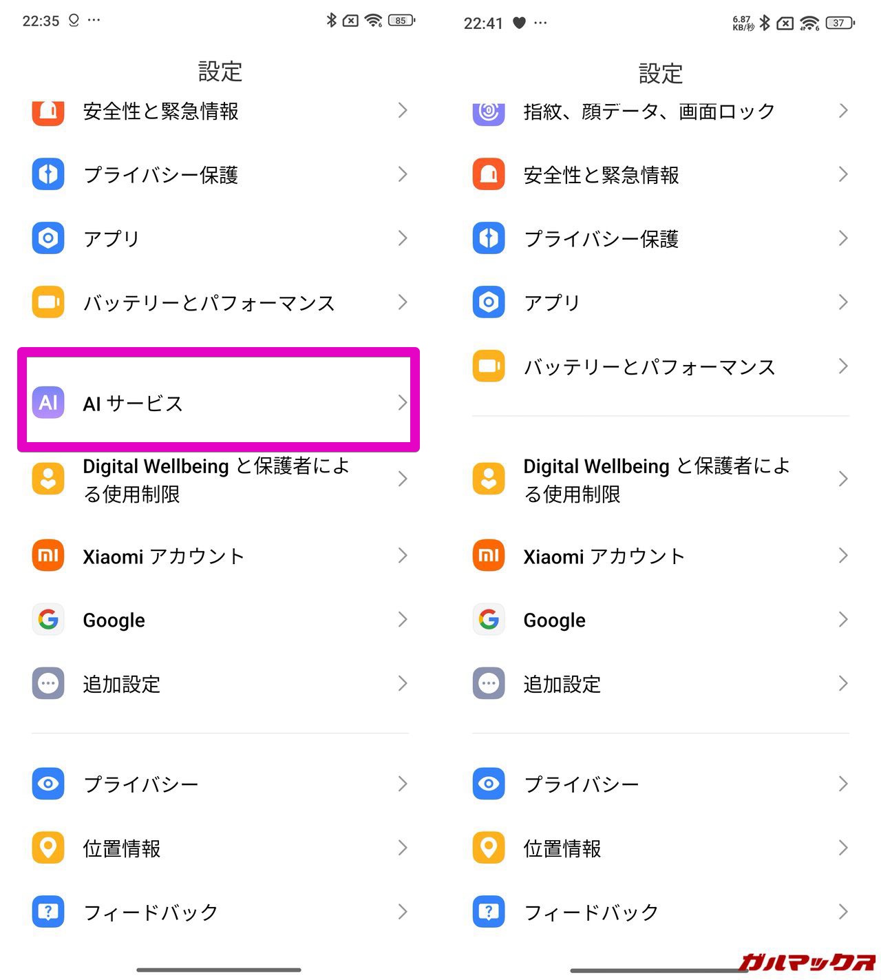 ▼それがこれ。本機は設定項目に「AIサービス」という項目が表示されてます。左が本機で→がNote 14 Pro 5G。↓