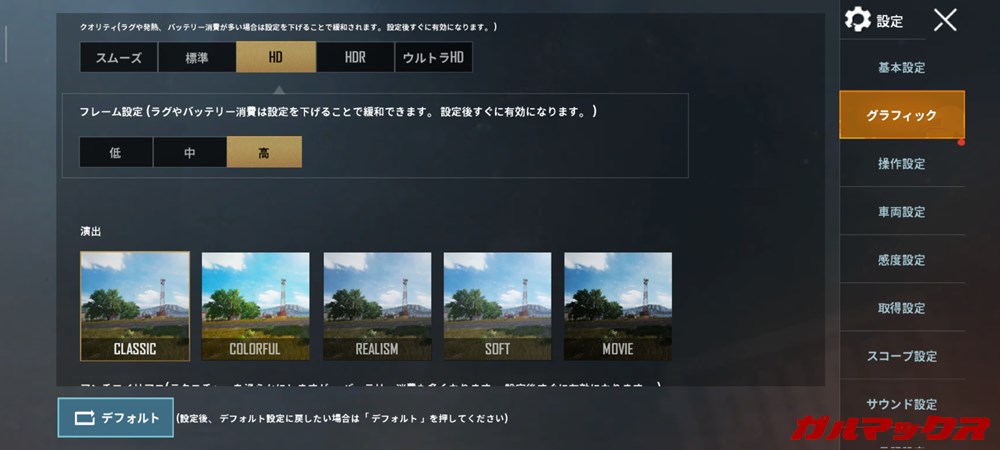 ただフレームレート設定は最上級設定である「極限」が選べないのは残念です。なのでプロゲーマー好みの味付けである「スムーズ+極限」が使えない(´・ω・`)。ミドルハイSoCながらちょっと惜しいなって印象でした。
