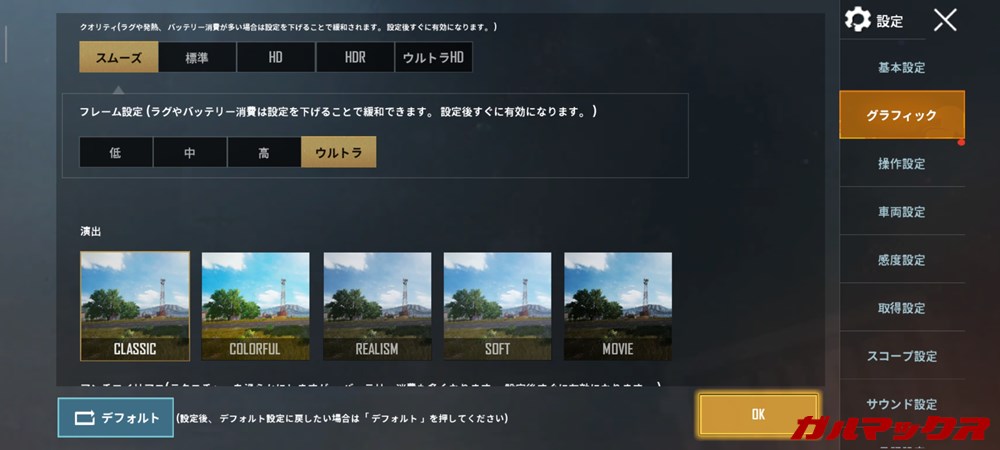▼画質設定を一番低い「スムーズ」にすればゲームのヌルヌル度に直結するフレームレート設定は「ウルトラ」まで設定できます!↓