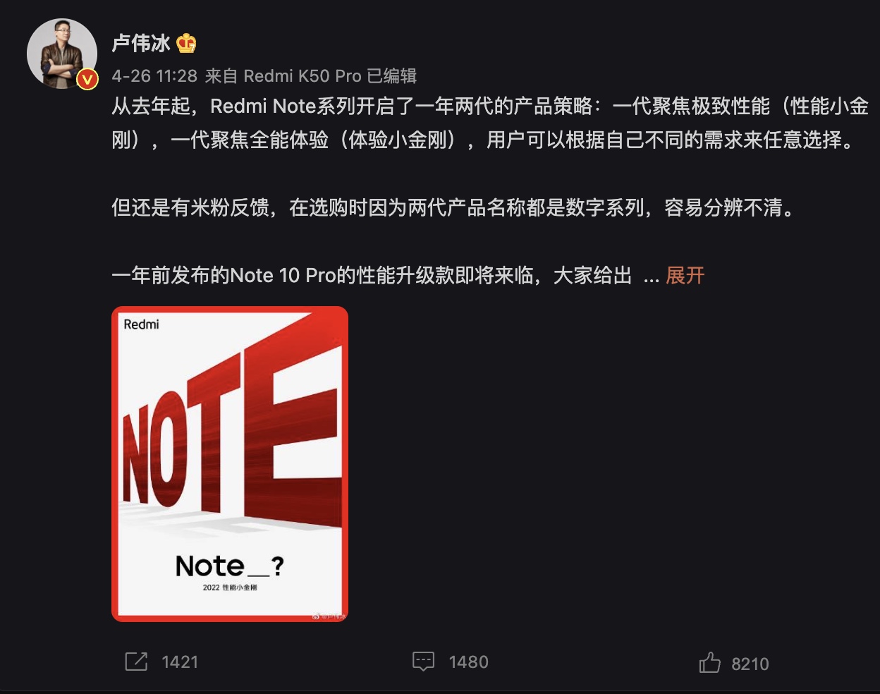 Redmi Note 10 Pro 5Gはパフォーマンス重視型にあたり、Redmi Note 11 Pro 5Gは万能型であることから、Redmi Note 10 Pro 5Gの純粋な後継機としてはRedmi Note 12シリーズになると推測されますが、このパフォーマンス重視型をより分かりやすくユーザーに伝えるにはどのようなモデル名が良いかアイディアを募っているようです。