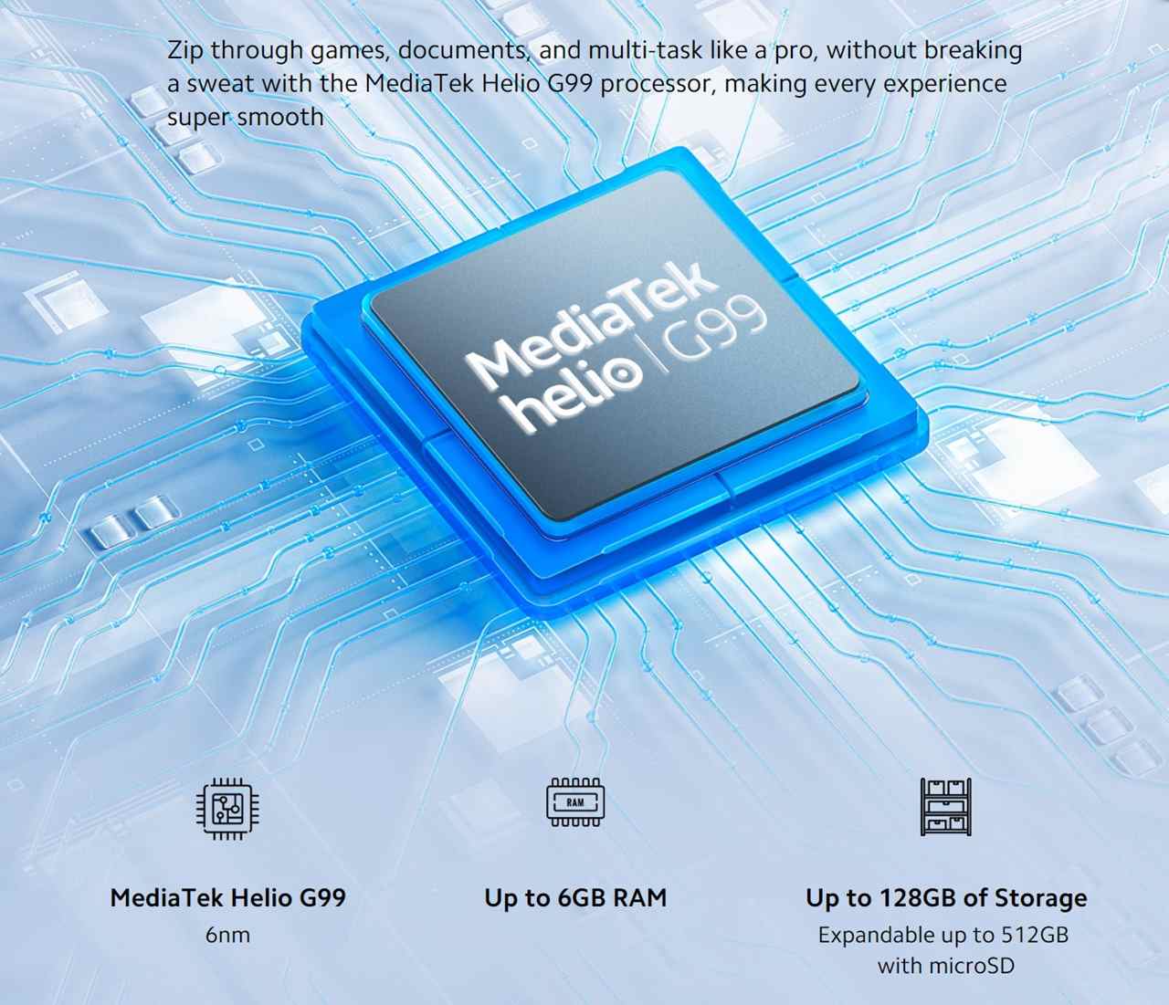 ▼SoCはMediaTekのHelio G99を採用!新型チップセットでミドルレンジでもかなり高いスペックだ!軽量なゲームはもちろん、3Dゲームも画質を落とせば遊べそうで非常に期待値高い!↓
