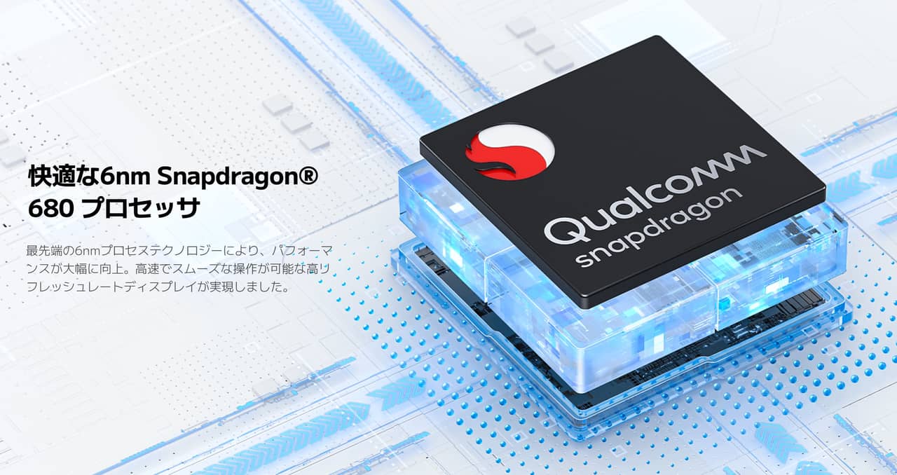 ▼SoCはSnapdragon 680!AnTuTu v9の参考値にて約24万点近くのスコアを記録しており、WEB、電子書籍、動画視聴といったライトユースであれば引っかかりにくいスペックでギリ快適か?ってあたり。↓