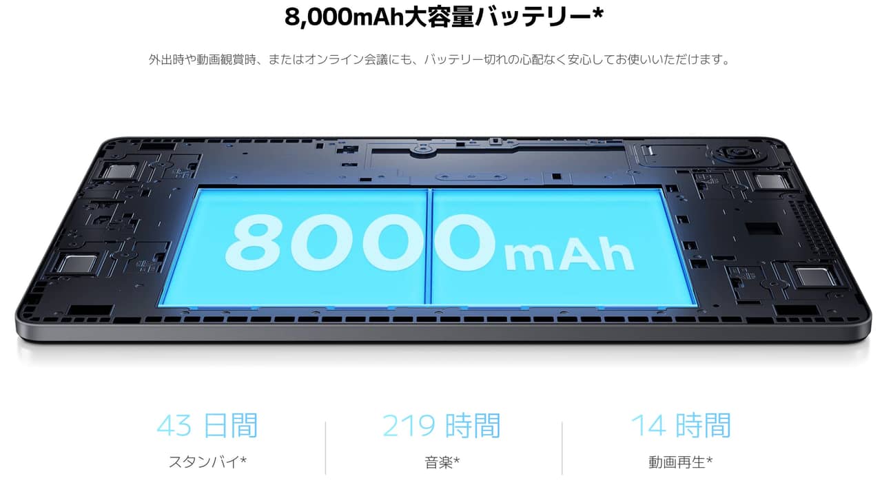 ▼バッテリー容量は8,000mAhと大容量。電池持ちでは動画再生で14時間の電池持ちとのこと!ずっと動画見てても半日使えるってのは十分良いと思えます。↓