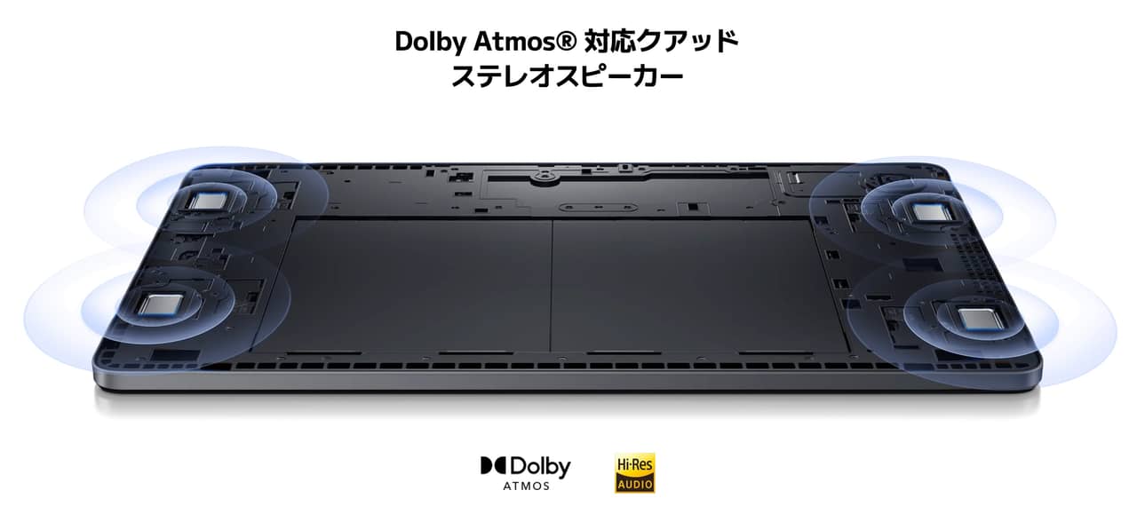 ▼スピーカーもこだわっており、なんと4基搭載のクアッドスピーカーとなっていますよ!ハイエンドなXiaomi Pad 6やRedmi Pad同様に豪華なスペック。音質や臨場感の高さも期待がかかります。↓
