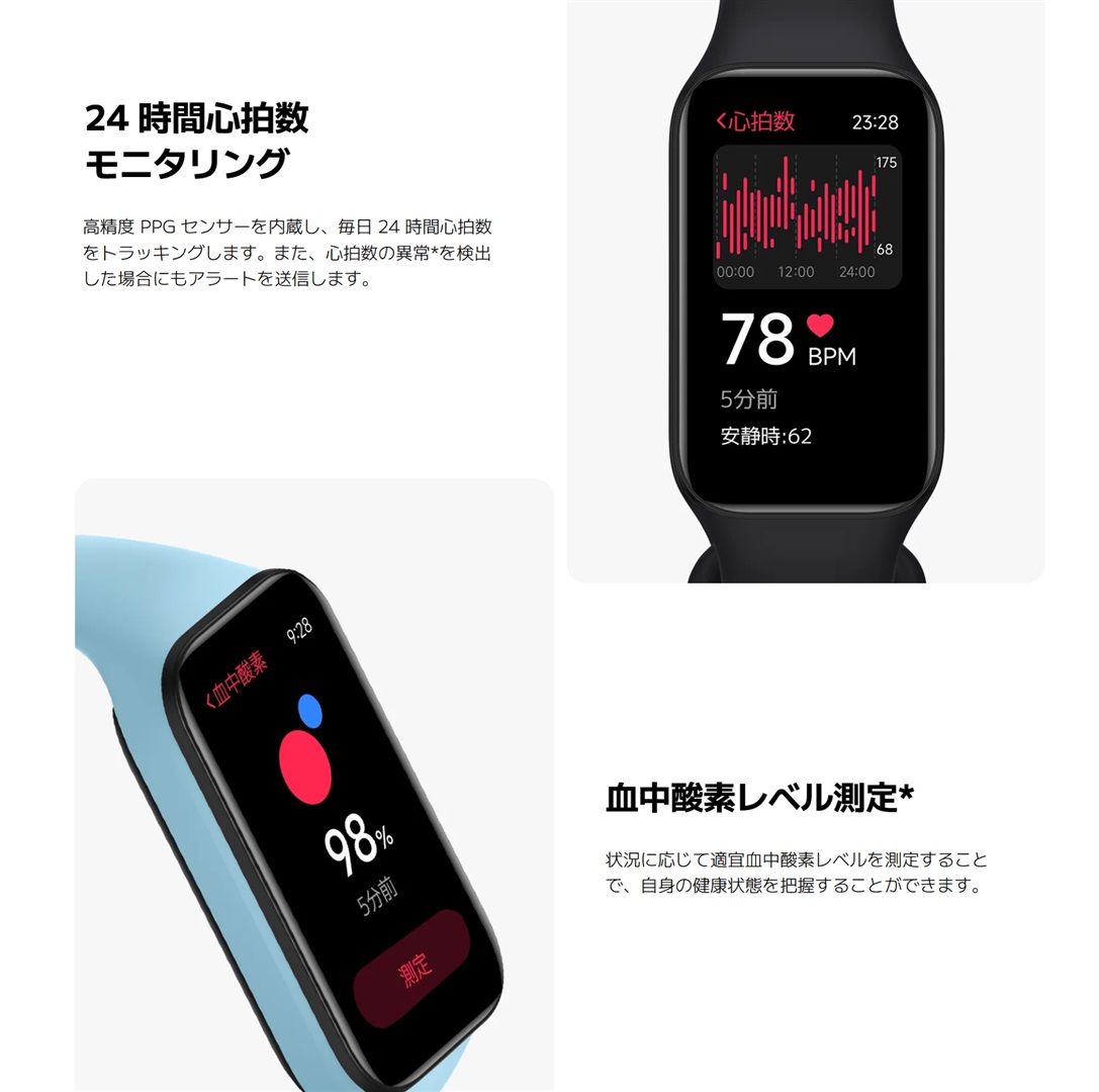 - 24時間心拍数測定や血中酸素、睡眠のモニタリングに対応