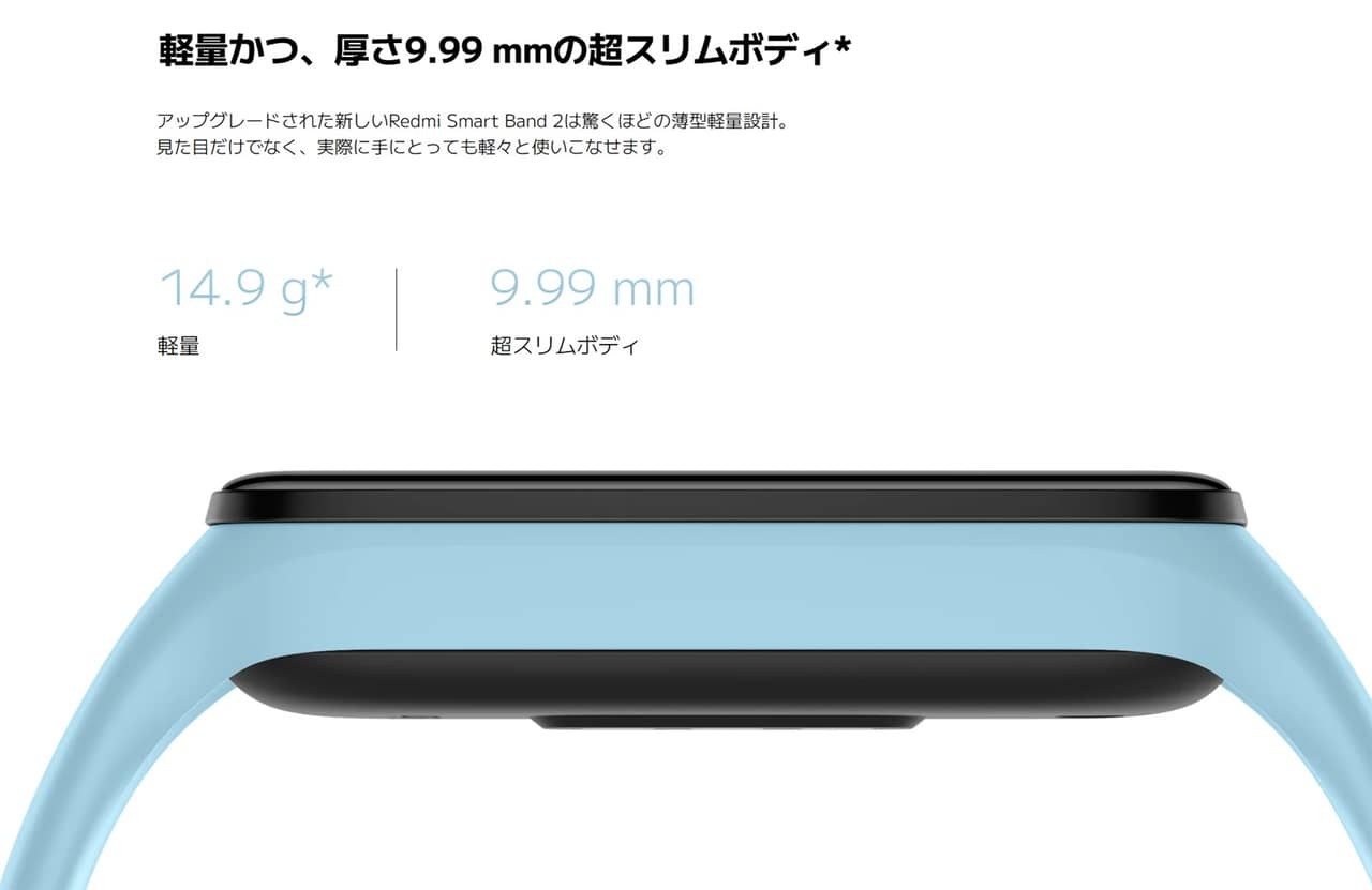 ▼Redmi Smart Band 2は本体重量14.9gで厚みは9.99mmと、多くのスマートバンドのなかでも軽量・薄型なのが魅力。↓