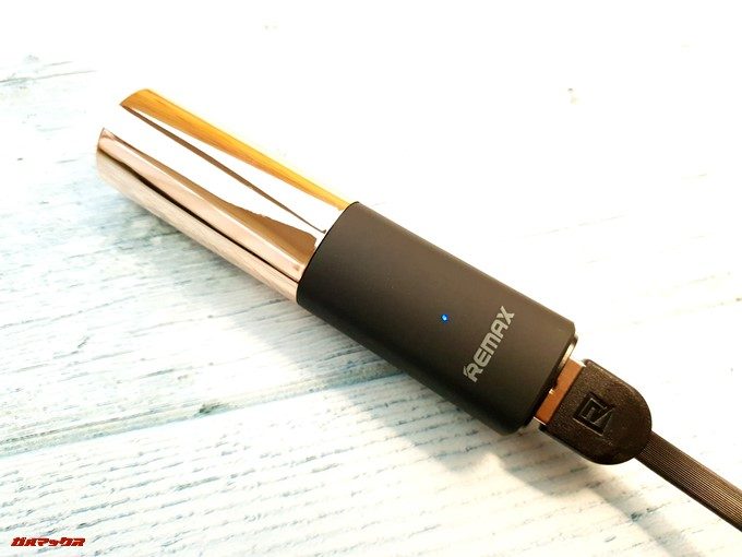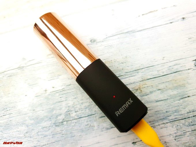 ▼ルージュであれば持ち手?の部分にインジケーターも内蔵。給電中はブルー、LIP-MAXを充電中は赤く光ります。↓