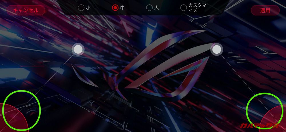 このタッチ式L/RボタンはROG Phone 2の「GAME GENIE」で管理可能。L/Rのボタンに連動する仮想ボタンが画面上に表示され、射撃やAIMボタンに割り当てることでゲームコントローラー並の操作感を得られるんです。