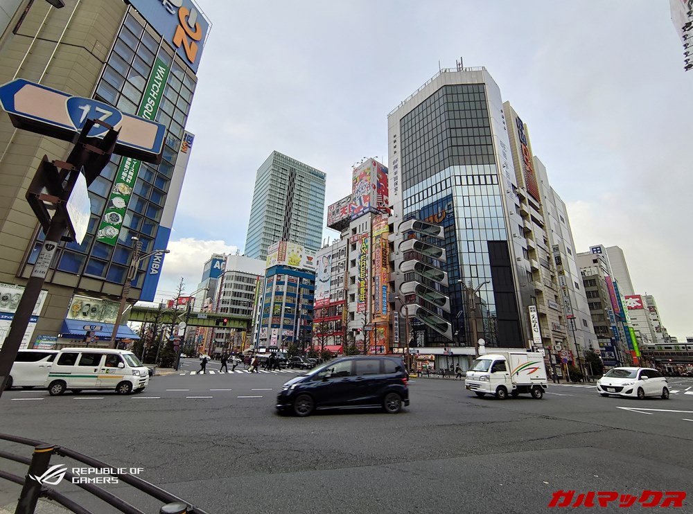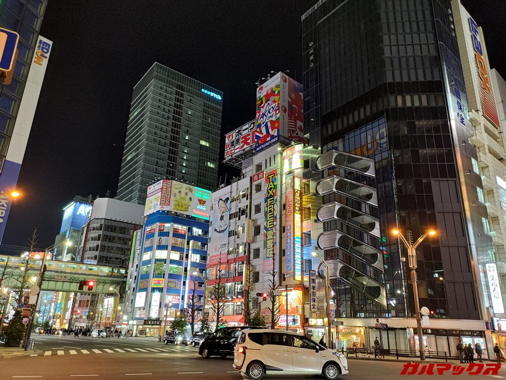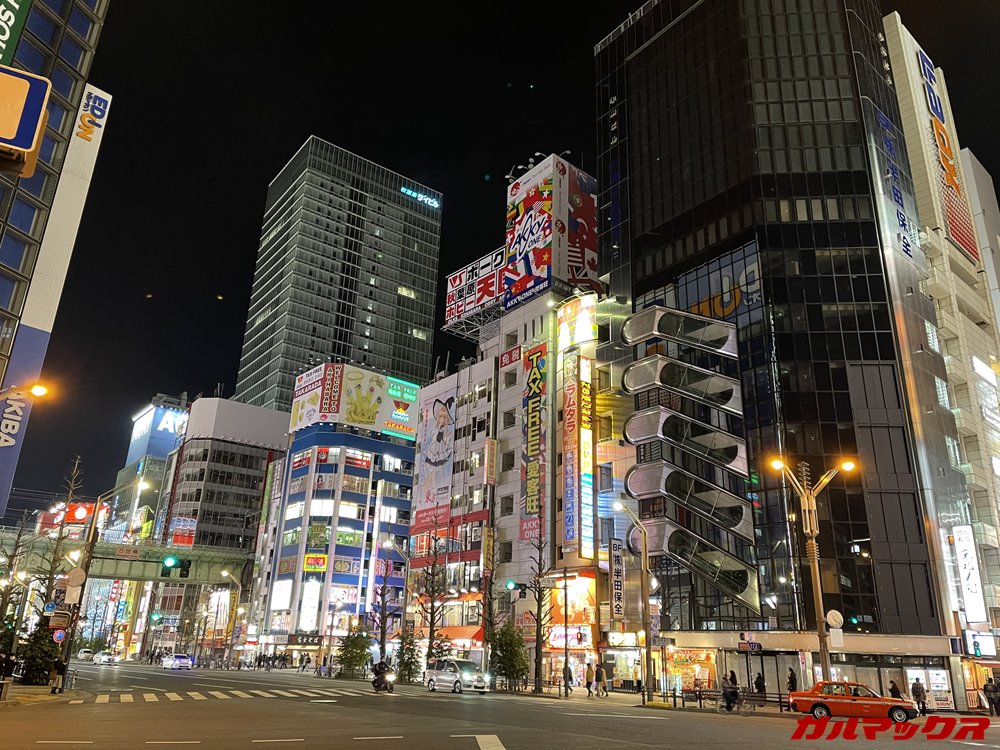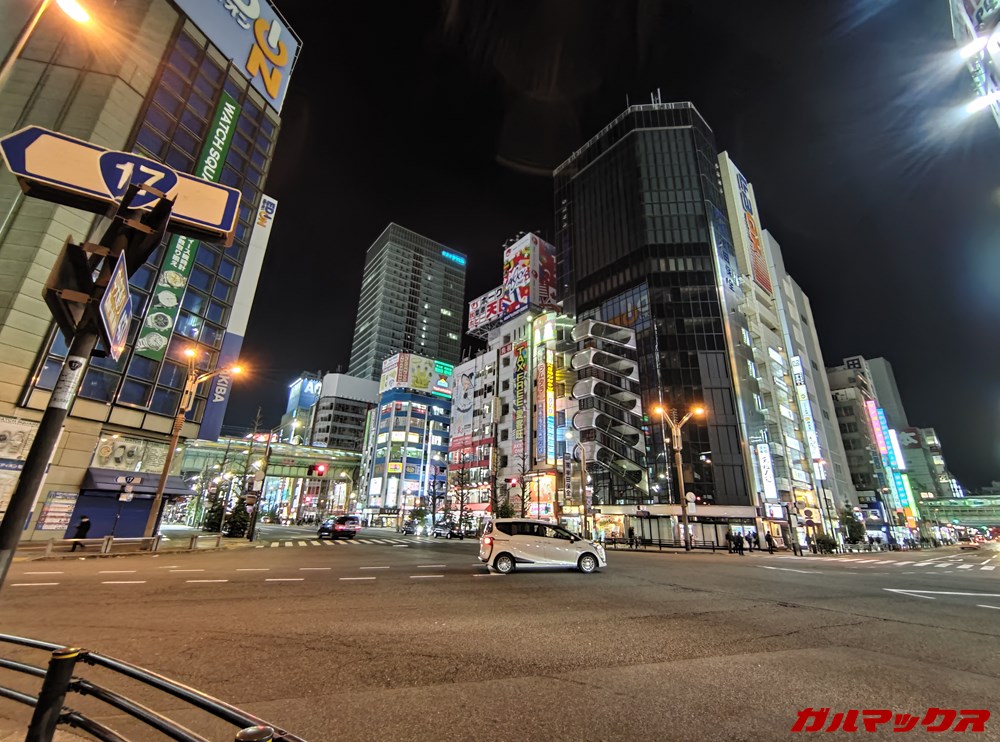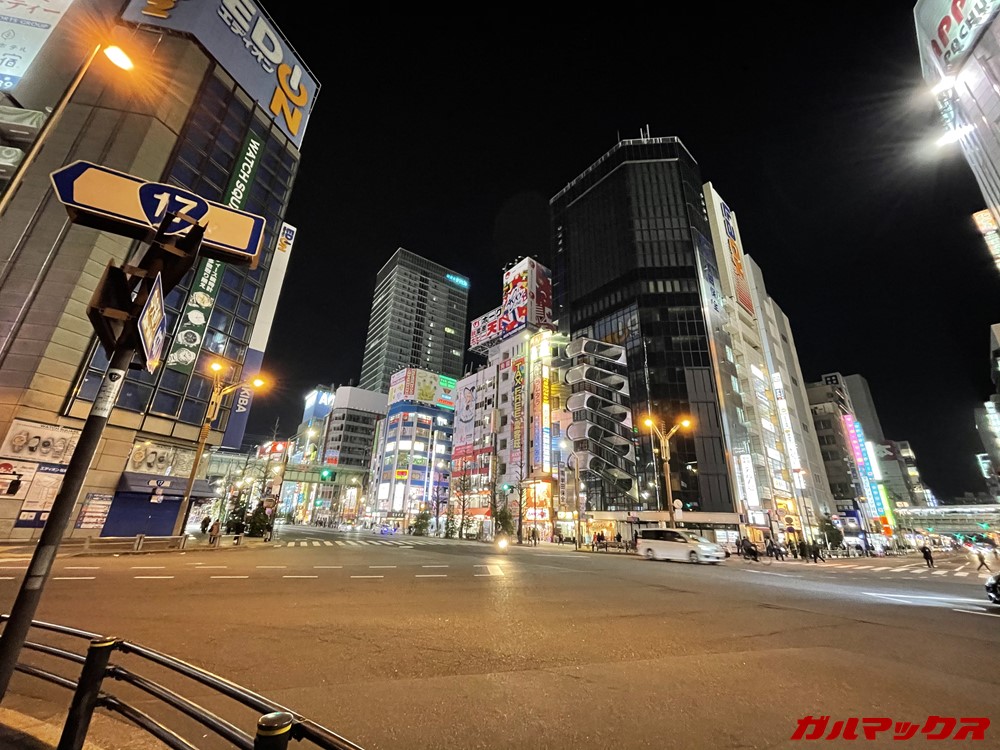 秋葉原の交差点の夜景撮影!照明が鮮やかですが、白飛びを抑えられており好印象。どっちかというとiPhone 12 Pro Maxのほうが筆者的には好みですが実用性はどちらもバッチリ!