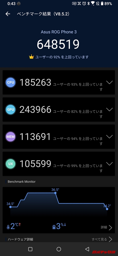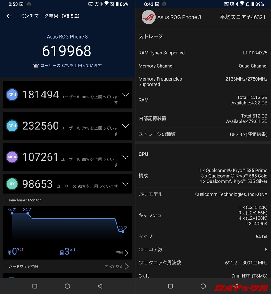 ▼ROG Phone 3の実機でAnTuTu(Ver8)を測定しました!総合スコアは619,968点、GPUスコアは232,560点です!↓