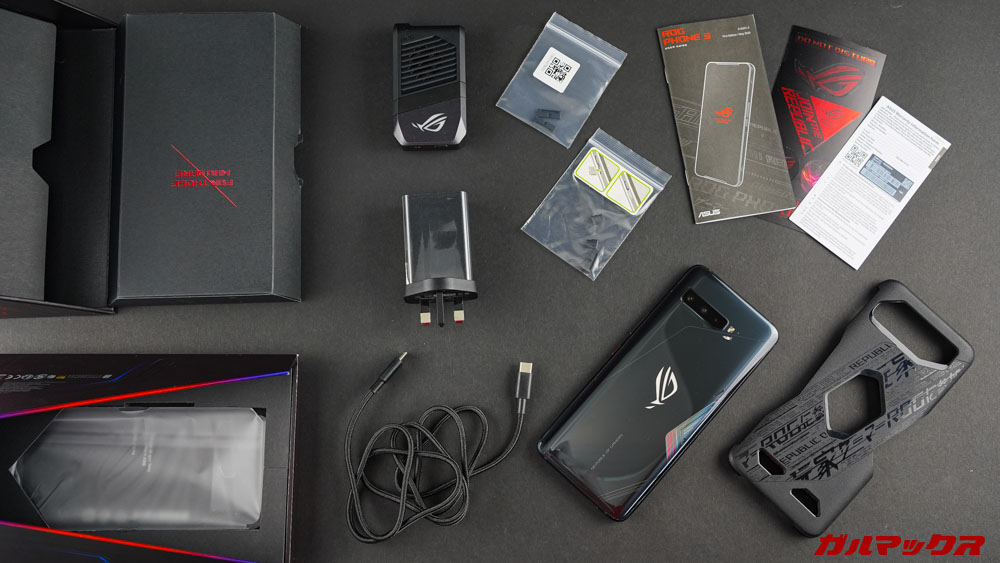 付属品は充電アダプターにケーブル、イヤホン変換ケーブル、専用のケース、説明書などの冊子、ステッカー、端子キャップそして専用クーラーユニット。とても充実した構成です!