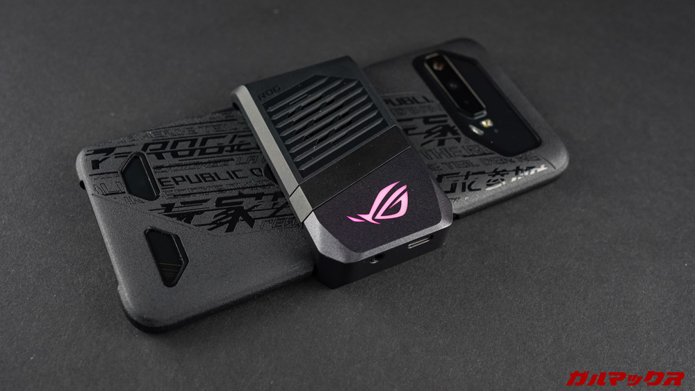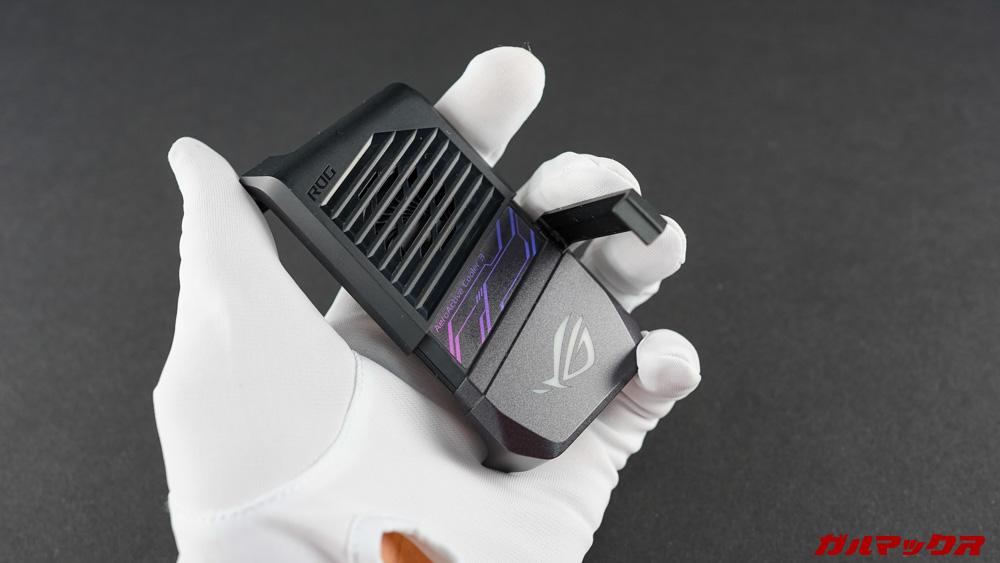 ▼ROG Phone 3専用のクーラーユニット。側面部の大型端子に挿すことで冷却ファンが周り発熱をおさえる仕組みになっています。ファンの音は小型のノートPCぐらいで、日常使いでは気になりませんでしたが図書館とかシーンとしているシーンでは気になるかもってレベル。↓